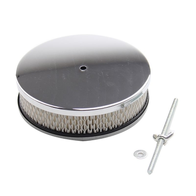 The high performance air filters have chrome plated steel cover and base. they fit most carburetors with a 5-1/8 " or 2-5/16" or 2-5/8" neck. The air filter comes with the stud, retaining wing nut and white paper filter.