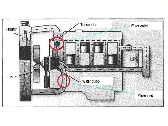 The engine thermostat is installed at the water inlet to overcome the fluctuation of the engine coolant temperature. When the engine cools down, the thermostat main valve closes the main water channel, while the bypass valve opens the bypass water channel. Coolant in the cylinder flows out from the uppper water outlet into water pump via bypass water channel, and later pumped back into the cylinder. When coolant in the cylinder rise at the temperature of thermostat opening, the main valve of the thermostat opens slightly, while the bypass valve closes slightly at the same time. At this moment, cooling water flows in two ways, Some water repeats the above cycle, and other water flows into radiator through water outlet of upper engine and into water pump via thermostat main valve, and finally pumped back into the cylinder.