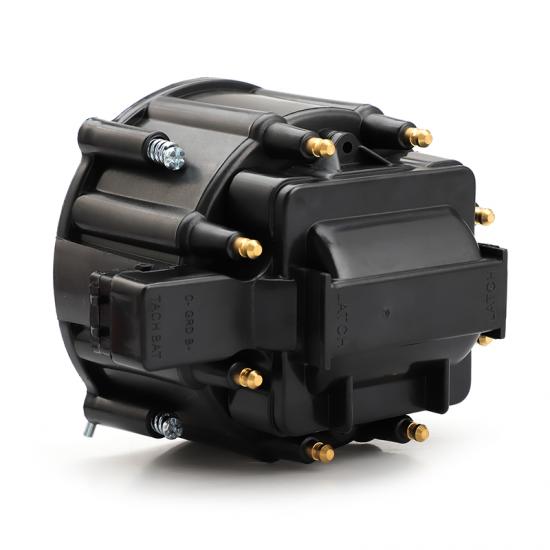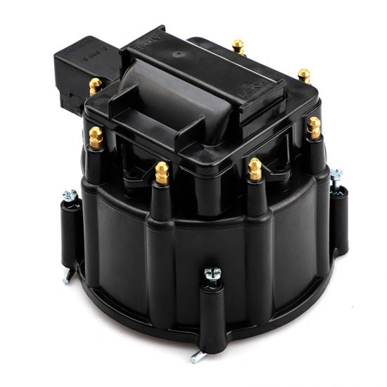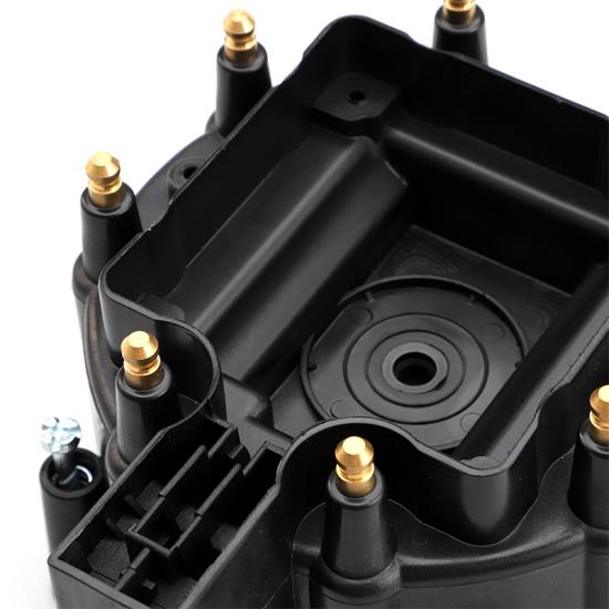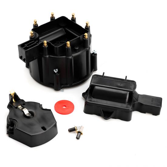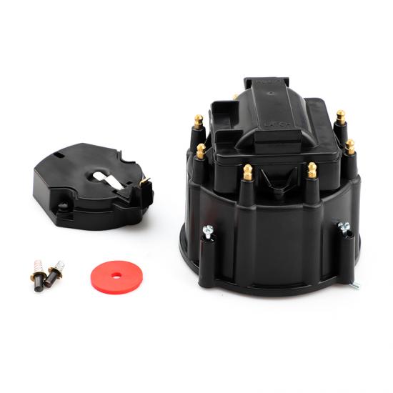 The 80103052 Distributor Cap and Rotor Kit creates an impenetrable barrier to arc-through and crossfire. Specially designed to combat the severe demands placed on high-output ignition systems in GM V8 engines, this black HEI Coil-in-Cap style distributor cap guards against the high temperature and surges of spark current that can melt molded components in OE caps.
